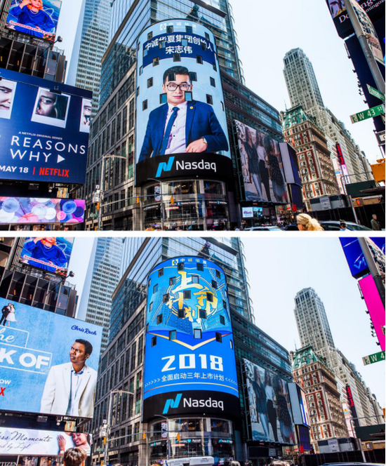 2018年5月10日(當(dāng)?shù)貢r(shí)間5月9日),中誠華夏集團(tuán)在素有“世界第一屏”美譽(yù)的納斯達(dá)克大屏驚艷亮相!